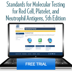 This two-week free trial gives readers access to the full 5th edition of Standards for Molecular Testing for Red Cell, Platelet, and Neutrophil Antigens in AABB’s Standards Portal. There is no obligation to purchase access to the Portal after the free trial expires.